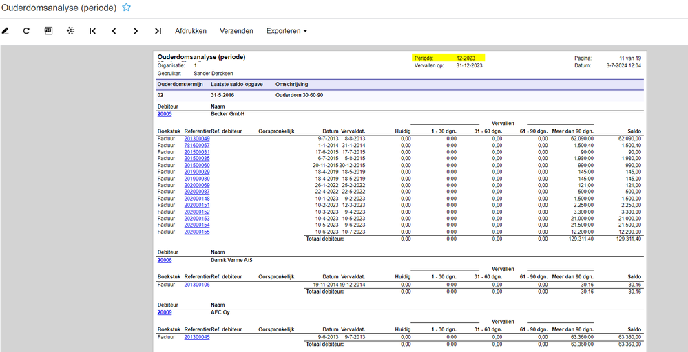 De naam van het rapport Betalingsanalyse (periode) is gewijzigd naar Ouderdomsanalyse (periode). Deze nieuwe benaming sluit beter aan bij het doel van het rapport: het bieden van inzicht in de ouderdom van posten op de gegeven periode.