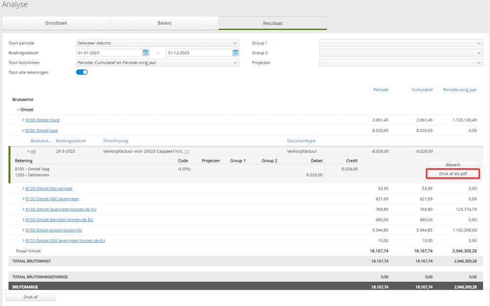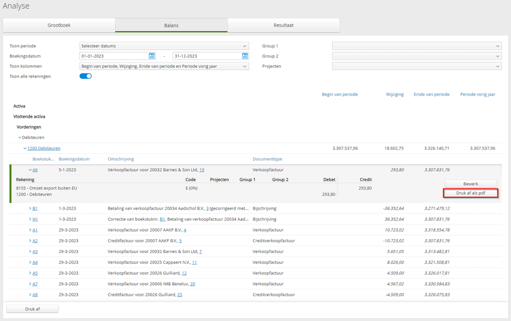Vanuit de Analyse kan je nu direct een boekstukoverzicht vanuit de Balans en het Resultaat afdrukken als pdf. Voorheen was deze optie enkel beschikbaar in het Grootboek.