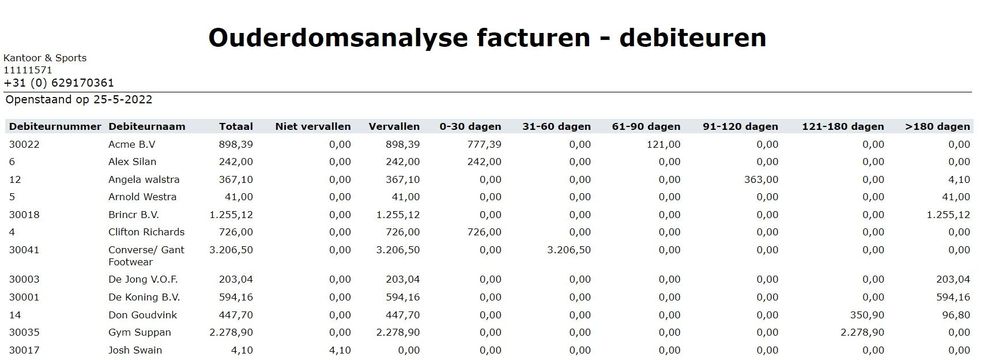 Zo kan je per debiteur/crediteur zien wat het totaalbedrag is wat nog open staat, maar ook of de facturen wel of niet vervallen zijn. Indien gewenst kan specifiek één debiteur of crediteur worden opgeroepen waarbij je kan aangeven wat de stand van zaken is op een bepaalde datum.