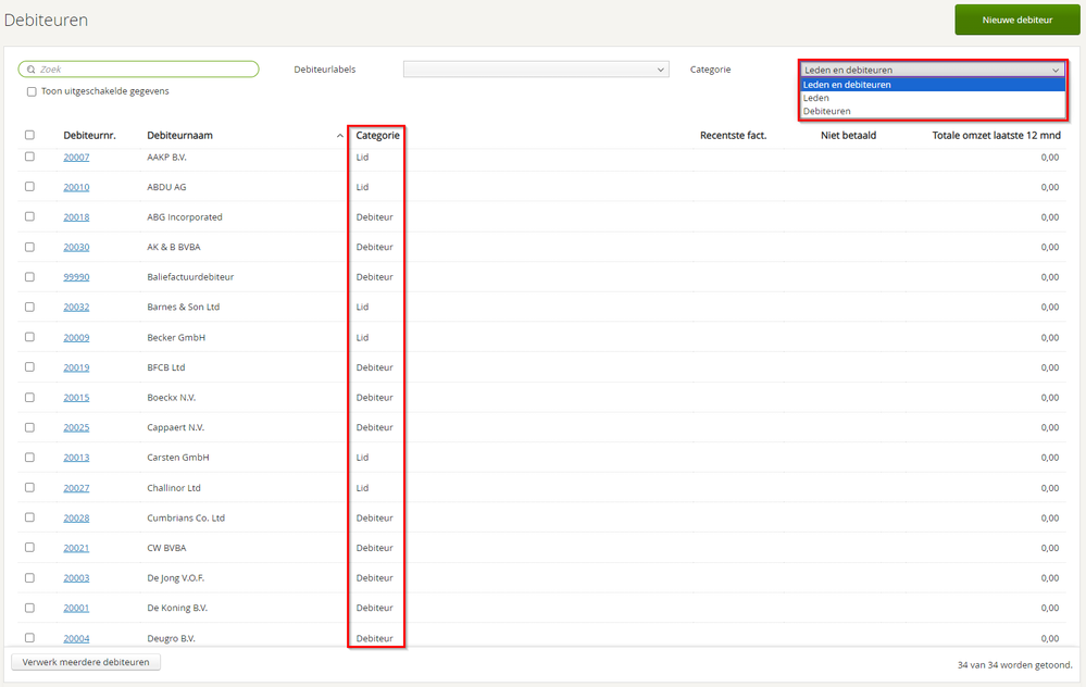 In het debiteurenoverzicht zie je in de kolom Categorie of een debiteur een lid is of alleen een debiteur. De lijst kan gemakkelijk gefilterd worden op debiteuren en leden (standaard), alleen leden of alleen debiteuren. Lidmaatschappen kunnen hierdoor efficiënt worden beheerd.