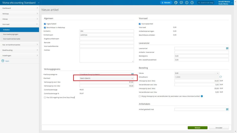 Het enige wat u hiervoor hoeft te doen is de nieuwe artikeleenheid Batch te selecteren bij het aanmaken van een artikel.
