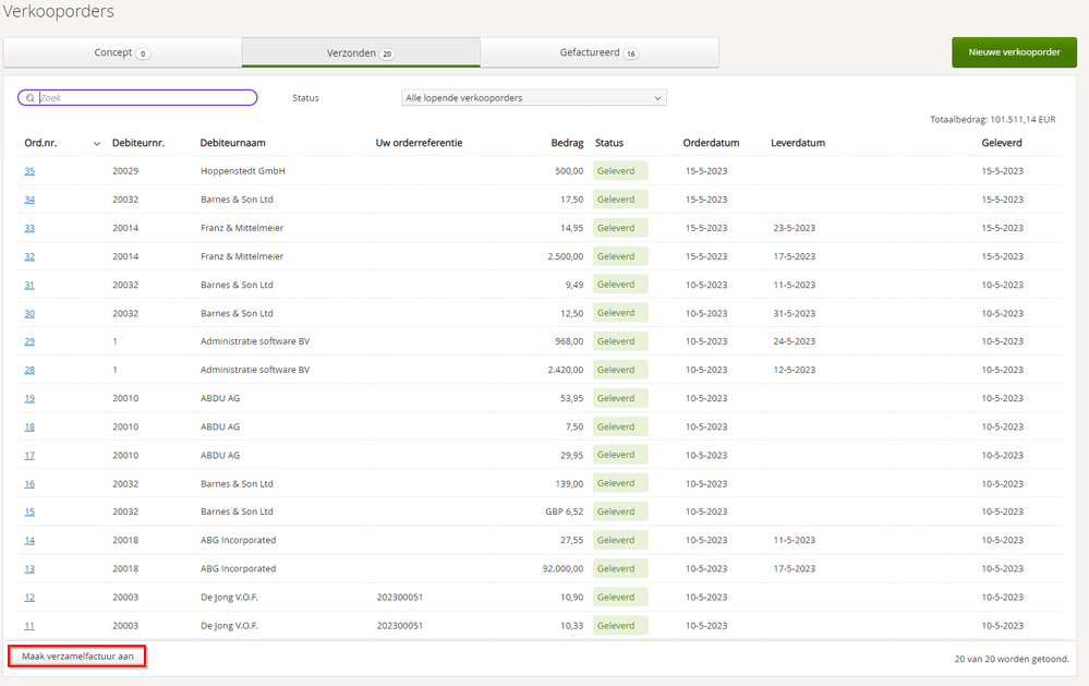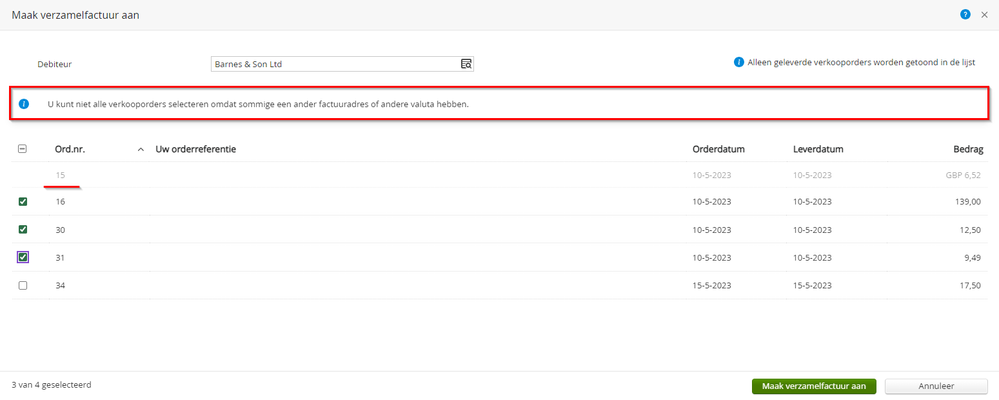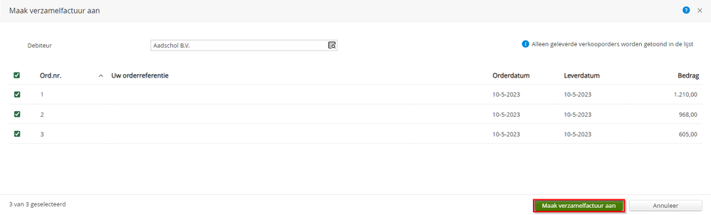 Alleen debiteuren waarvoor twee of meer geleverde orders klaar staan worden getoond. Vervolgens kunnen de orders geselecteerd worden die moeten worden opgenomen in de verzamelfactuur.
