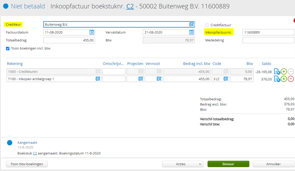 In deze update is het veel eenvoudiger geworden om een invoerfout in een inkoopfactuur te herstellen nadat de inkoopfactuur is geboekt. Als de instelling Instellingen/Bedrijf/Facturering, Sta bewerken van inkoopfacturen toe is geactiveerd kan onder andere het veld Crediteur en Inkoopfactuurnummer nog worden aangepast. Het is mogelijk om aanpassingen door te voeren mits de factuur: