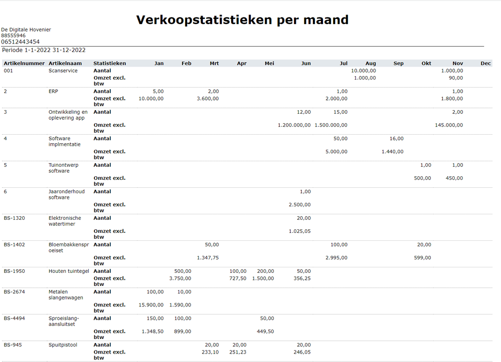 Er is een nieuw rapport beschikbaar gekomen waarmee je nu eenvoudig op artikelniveau kan zien wat er per maand verkocht is in een geselecteerde periode. Met dit rapport krijg je beter inzicht in de verkopen per artikel op maandbasis waarbij de totalen per maand eenvoudig vergeleken kunnen worden.