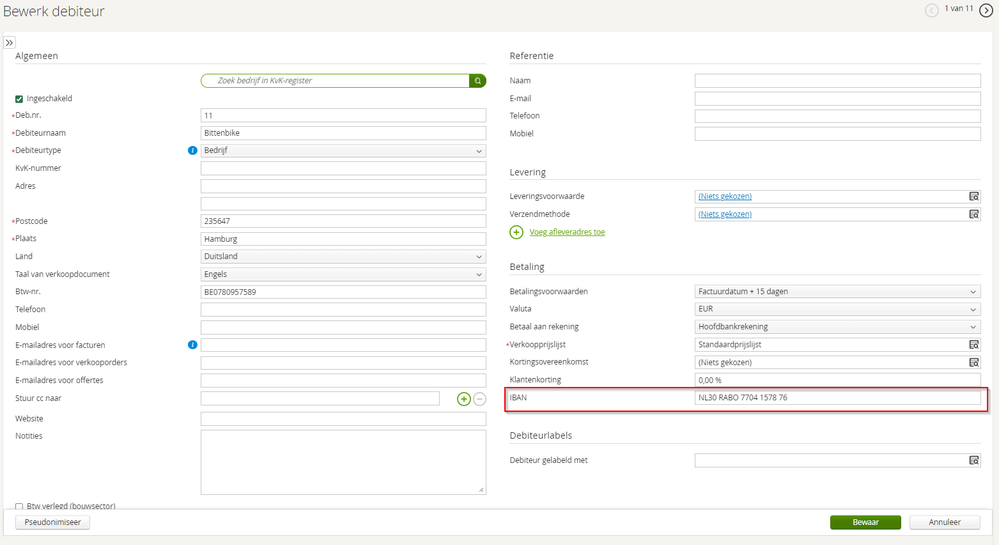 We hebben het IBAN-veld toegevoegd aan de debiteurgegevens, te vinden onder het kopje Betaling. De IBAN zal een belangrijke rol gaan spelen bij functionaliteit die momenteel in ontwikkeling is, zoals de automatische-incassomodule en het verbeteren van de factuurherkenning in Kas- en banktransacties.