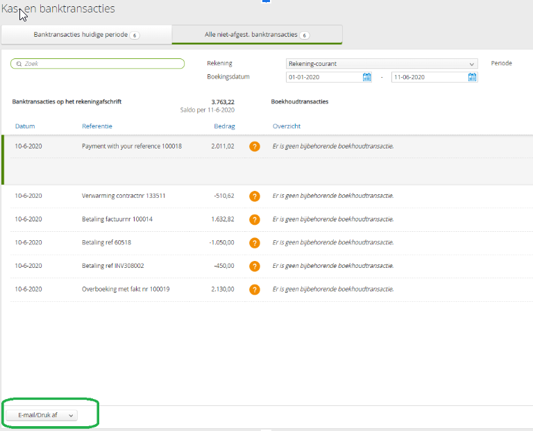Het is nu mogelijk om vanuit de niet-afgestemde transacties een pdf-bestand met de niet-afgestemde banktransacties te mailen of af te drukken: