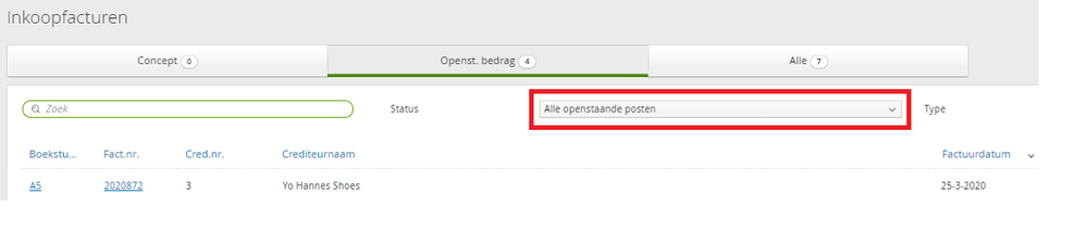 Uit feedback van onze gebruikers bleek dat vaak naar openstaande posten gezocht moest worden in de lijsten met facturen. Vanaf vandaag staat daarom bij de inkoopfacturen onder de tab ‘Openst. bedrag’ de statusfilter standaard op ‘Alle openstaande posten’.