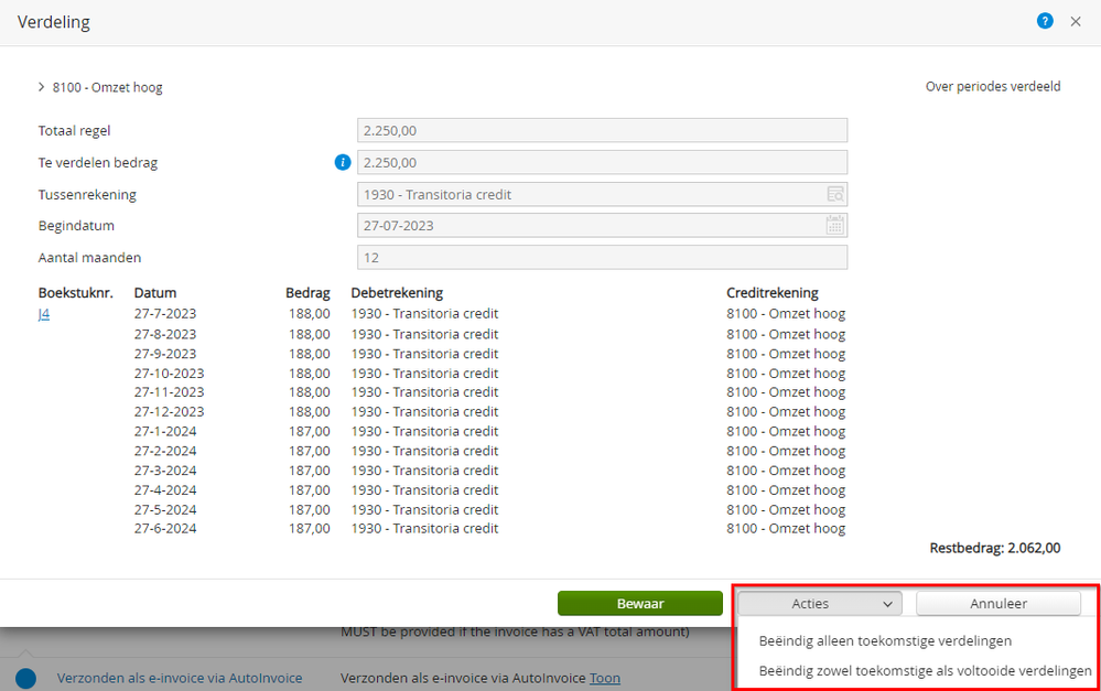 Voor Visma eAccounting Pro hebben we een nieuwe actieknop toegevoegd voor het beëindigen van verdeling. Wanneer een verkoopfactuur verdeeld is over meerdere perioden en er al verdelingen zijn geboekt, kan er nu voor gekozen worden om de verdelingen volledig te beëindigen, of enkel de toekomstige verdelingen te beëindigen. Voorheen was het alleen mogelijk de volledige verdeling inclusief de reeds geboekte verdelingen te beëindigen. Deze functionaliteit was al beschikbaar voor het beëindigen van verdeelde inkoopfacturen.