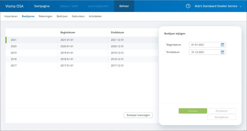 Nieuw is het venster Beheer/Boekjaren. In dit venster kunnen boekjaren worden toegevoegd, aangepast en verwijderd. Het is daarmee nu mogelijk om de boekjaren gelijk te houden aan de boekjaren in Visma eAccounting. De functie "Boekjaar" op de Startpagina komt hiermee te vervallen.