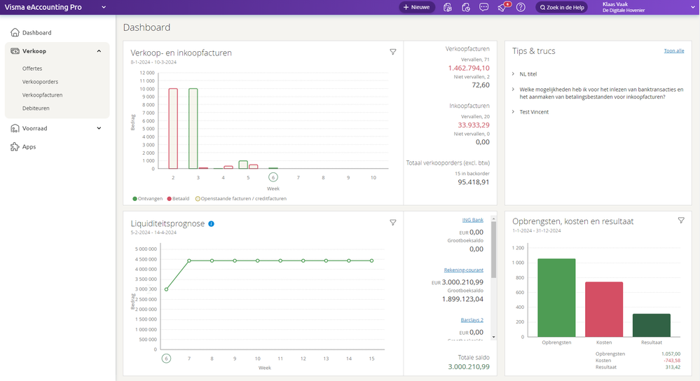 Bij Alleen lezen toegang heeft de gebruiker inzicht in de vensters en kan deze gebruiker rapporten printen, de gebruiker kan echter geen wijzigingen aanbrengen. Indien een gebruiker Geen toegang heeft voor een bepaalde module dan is het onderdeel ook niet aanwezig in de user interface. Hieronder een voorbeeld van een medewerker die enkel toegang heeft tot het Dashboard, Verkoop en Voorraad.