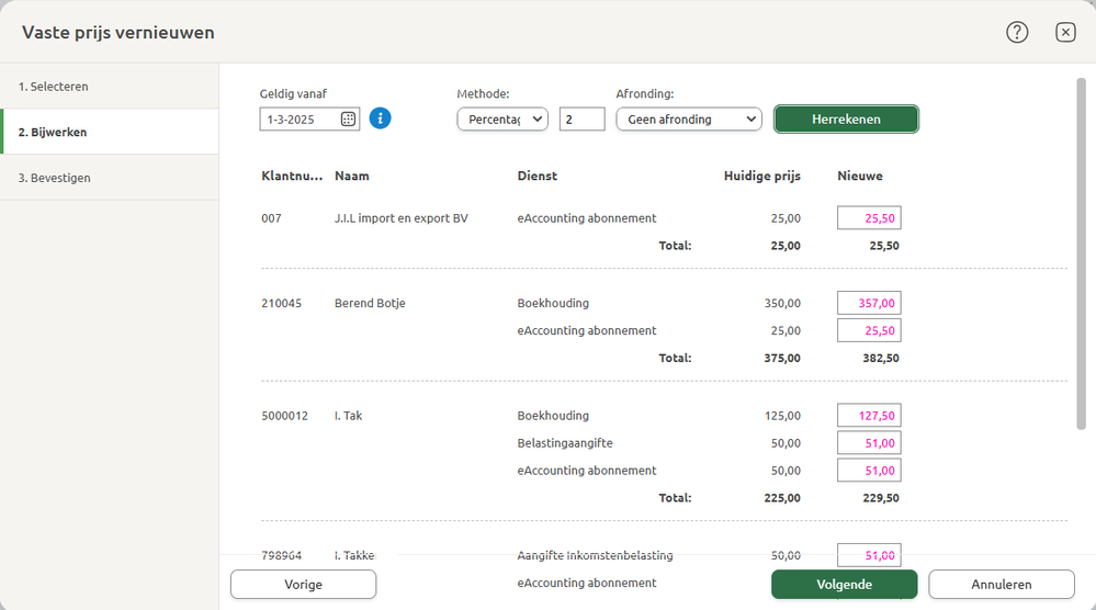Voor het bijwerken van de vaste prijzen is een nieuwe wizard toegevoegd. Het wizzard icoon is te vinden in het scherm klanten. In de wizard "Vaste prijs vernieuwen" kan op basis van de klantselectie, die eventueel vooraf is gemaakt, de vaste prijs worden aangepast.