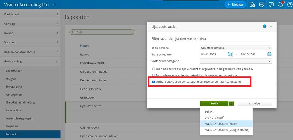 Bij het oproepen van het rapport bieden we nu een extra keuze om de subtotalen te verbergen bij het exporteren naar een csv-bestand. Dit geeft flexibiliteit om bijvoorbeeld zelf calculaties uit te voeren na het importeren in een spreadsheetprogramma.