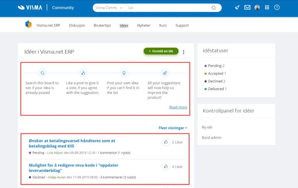 Idéene blir nå presentert i en ny og oversiktlig listevisning. Øverst på siden finner du en introduksjon til idéprosessen slik at dere som kunder kan se hvordan Visma jobber med ideene deres.