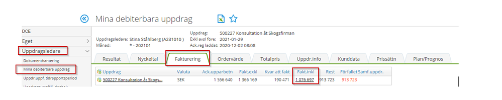Välj Uppdragsledare/Mina debiterbara uppdrag/Fakturering och klicka på Fakt inkl.