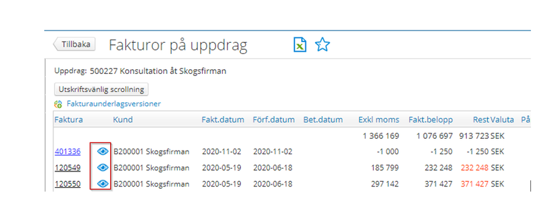 Fakturor som har skapats efter uppgradering till version 13 har ett öga som du klickar på och då öppnas fakturabilden i pdf-format. För de fakturor som inte har ett öga finns en funktion i klienten där man enkelt kan skapa en fakturabild i pdf-format.