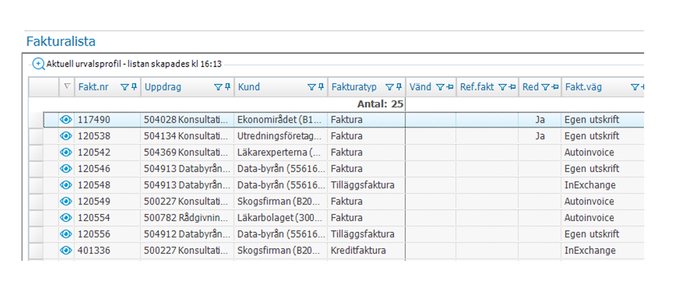 I klienten ser det ut så här i fakturalistan. (Nås via Fakturering/Hantera fakturor/Öppna)