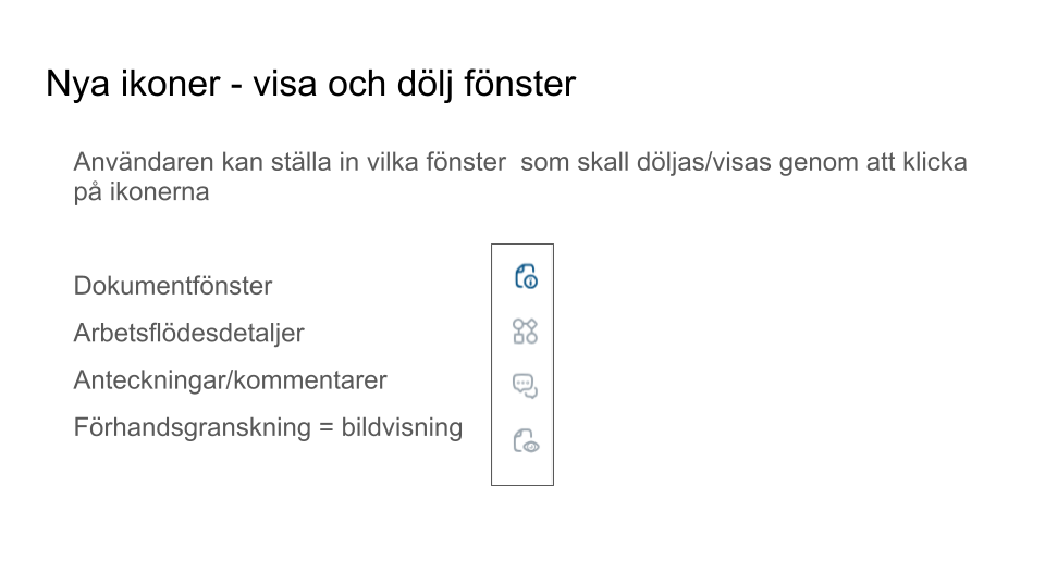 Funktionerna som ingår i användargränssnittet är oförändrade jämfört med det gamla gränssnittet, men sättet vi presenterar på har förändrats och du som användare kan själv välja vilka fönster som skall vara aktiva genom att klicka på ikonerna i listbaren till höger samt att knapparna för Godkänn, Avvisa och Andra åtgärder har flyttas upp till höger (se nedan)