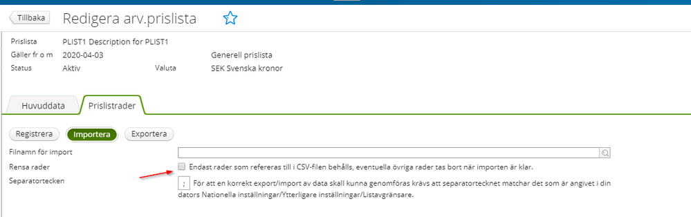 Du har även ett nytt val i samband med csv-importen att välja om det endast är raderna i filen som ska finnas kvar i prislistan.