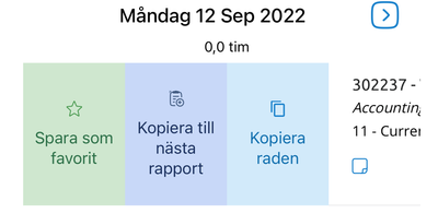 Kopiera till nästa rapport - T ex ett uppdrag, en tidkod, en text eller en kombination av valfria fält som du vet att du vill lägga tid på i kommande tidrapporter. Det ligger kvar tills du väljer att Sluta kopiera.