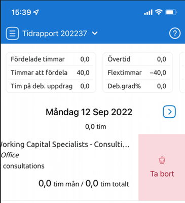 Det går även att "swipa" till vänster för att Ta bort en rad i tidrapporten.