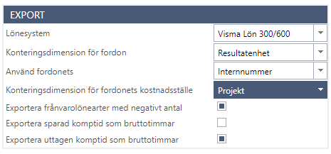 I rutan för Använd fordonets kan du välja om det ska skickas registreringsnummer eller internnummer, i det här fallet som resultatenhet. Alternativet kostnadsbärare används inte i Visma Lön, och kan bortses från.  Spara inställningarna och det är klart.