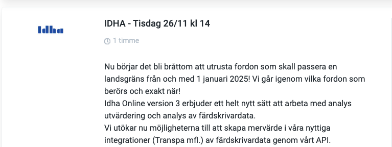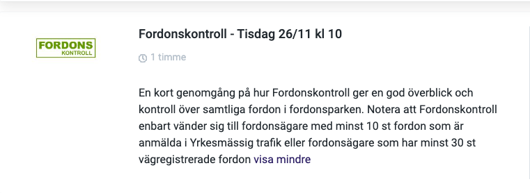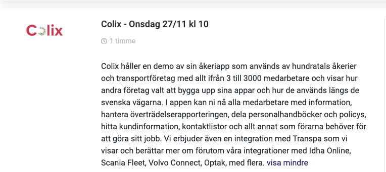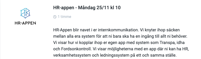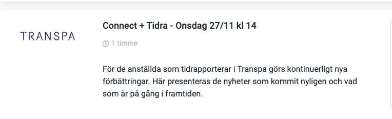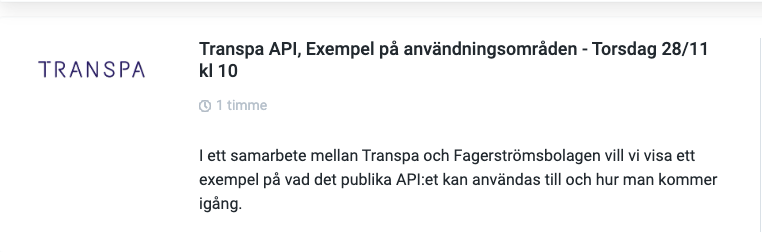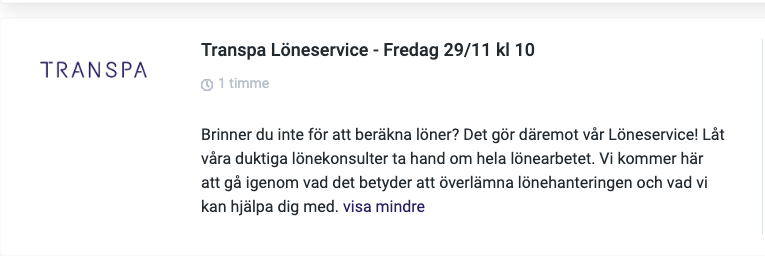 I tillägg kommer vi ifrån TRANSPA berätta om vår nya tidrapportering Tidra och Connect, vi visar upp användningsområden för vårt API tillsammans med Fagerströmsbolagen och veckan avslutas med att vår egen Löneservice berättar om fördelarna med att överlåte er lönehantering till oss.