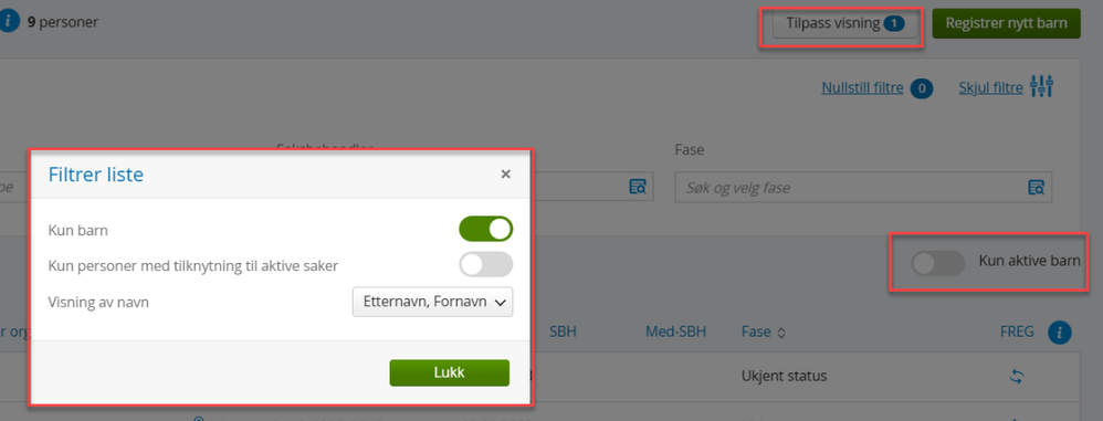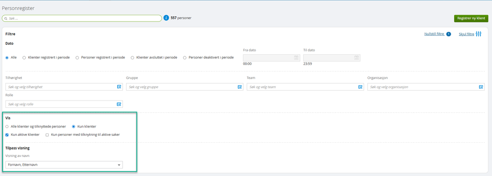 Alle filtre er tilgangsstyrt, så husk at du bare får treff på klient/hovedpersonen/personer du har tilgang til.