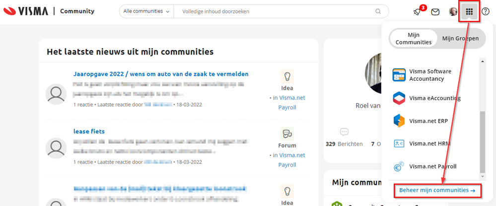 - Ga naar 'Mijn communities' via de 9 puntjes rechtsboven in het scherm - naast je profiel foto - en klik op 'Beheer mijn communities'
