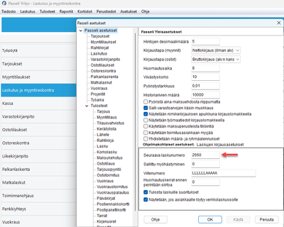 Seuraava laskunumero -kentässä näkyy seuraavan laadittavan laskun numero. Käyttöönoton yhteydessä kenttään voi antaa numeron, josta laskujen numerointi aloitetaan. Ohjelma huolehtii numeroinnista automaattisesti, joten numerointiin ei tule puuttua ohjelman käyttöönoton jälkeen.