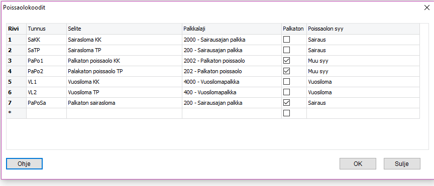 Poissaolokoodit luodaan sekä palkallisille poissaoloille että palkatomille poissaoloille ja tämän lisäksi tuntipalkkalaisille luodaan omat poissaolokoodit ja kuukausipalkkalaisille omat. Poissaolokoodit luodaan täällä: