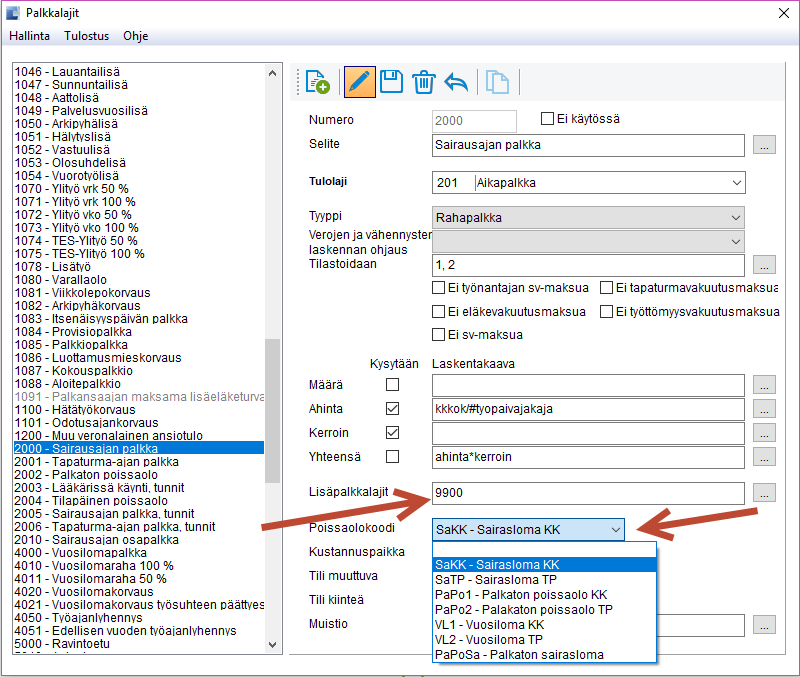 Kun poissaolokoodit on luotu käydään lisäämässä poissaolokäsittelyä varten tietoja myös Palkkalajeille täällä: