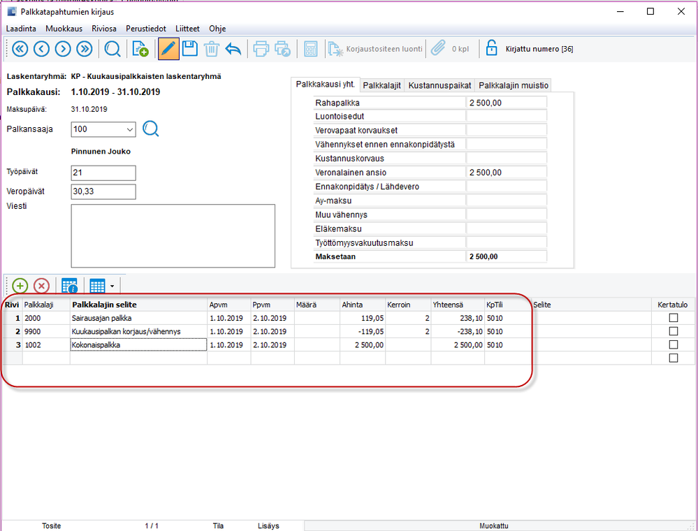 Esimerkki kuvissa Jouko on ollut sairaana kaksi päivää ja hänelle on tehty poissaolokirjaus Passeliin ja poissaolot tuodaan palkkalaskelmalle ja huomioidaan että Joukolle maksetaan kuukausipalkkaa sen verran vähemmän kun sairasajanpalkkaa vastaavalta ajalta kuukausipalkan tilalle maksetaan.