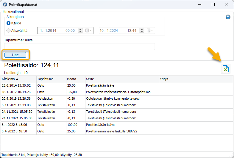 Mikäli halutaan katsoa tapahtumia tietyltä aikaväliltä, valitaan Aikarajaus-kohtaan aikaväli. Voit lisäksi tarkentaa hakua antamalla tiedoksi tapahtuman/selitteen tai vaikka yrityksen nimen.