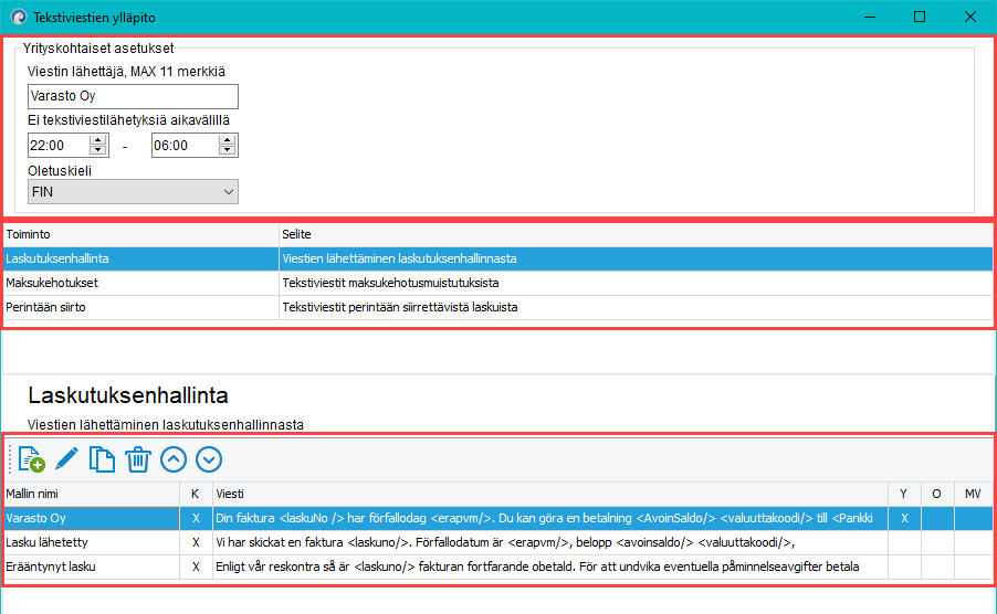 Ohjelmassa olevia tekstiviestimalleja pystyy muokkaamaan helposti ja kattavasti juuri oman yrityksen tarpeeseen. Tekstiviestimalleja pystyy muuttamaan tarjoukset, laskutus ja myyntireskontra sekä myyntitilaukset osioissa.