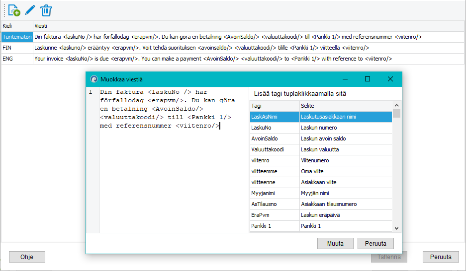 Muokkaa painikkeesta pääsette muokkaamaan viestin sisältöä. Viestiin voidaan kirjoittaa haluttu sisältö ja tageilla lisätä tietoja joita ohjelma hakee automaattisesti viestiin. Esimerkiksi jos lisää tagin yritysnimi, niin ohjelma tuo yrityksen perustiedoista yrityksenne nimen viestiin. Näin ollen nimen vaihtuesssa ei nimeä tarvitse muuttaa jokaiseen tekstiviestimalliin erikseen. Muutokset tulee tehdä jokaiseen kieliversioon erikseen, mikäli eri kieliversiot ovat käytössä.