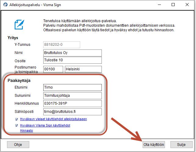 Jotta palvelun saa avattua tulee toiminnossa antaa yrityksen ja pääkäyttäjän tiedot sekä hyväksyä käyttöehdot