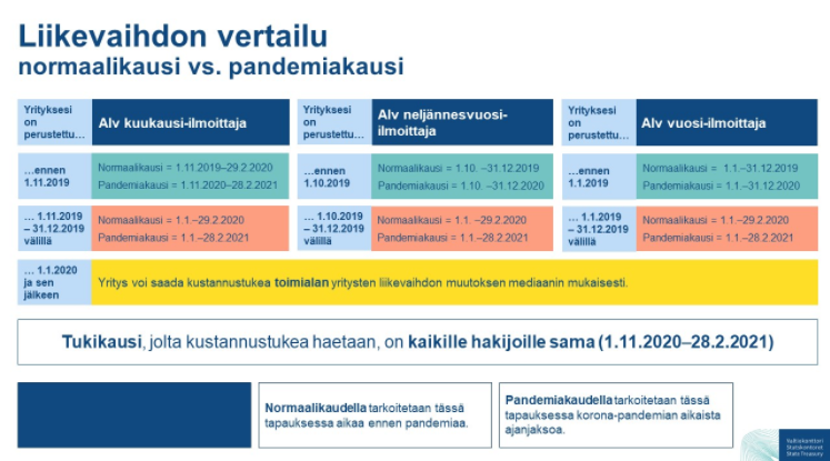 Pandemiakausi jonka perusteella voit yritysten kustannustukea hakea on 1.11.2020-28.2.2021 ja vertailukautesi eli normaalikausi on vastaava jakso edellisenä vuonna eli 1.11.2019-29.2.2020. Hae kustannustukea näillä tiedoilla, jos yrityksesi oma liikevaihto on alentunut yli 30 % pandemiakaudella vertailuajankohtaan nähden.