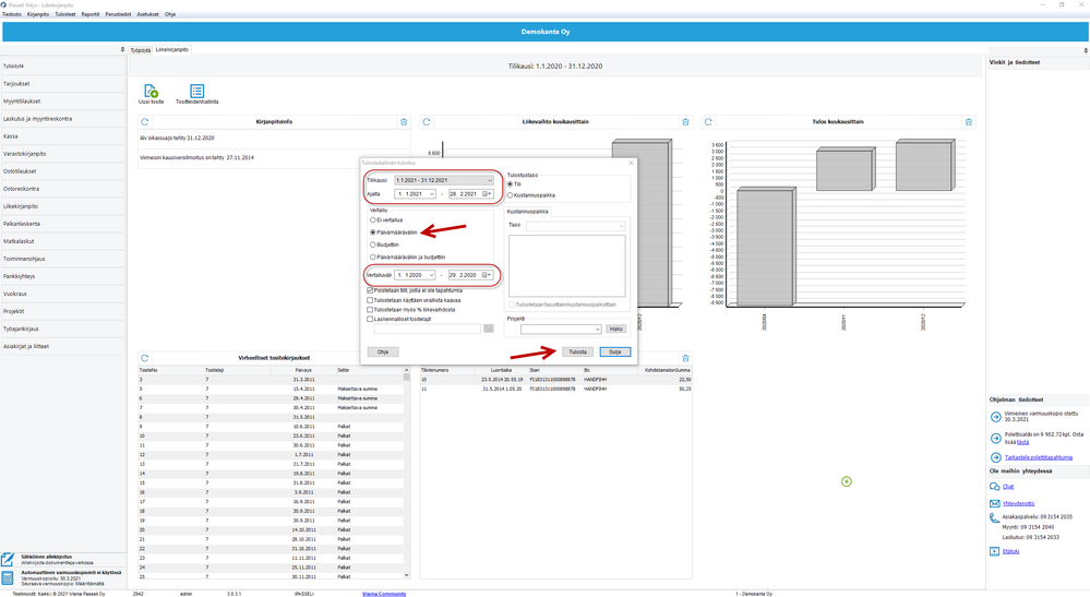 Voit tarkastaa liikevaihtosi kehityksen kyseisellä aikavälillä suoraan Passeli Yritys-ohjelmastasi. Valitse Liikekirjanpito-Tulosteet-Tuloslaskelma