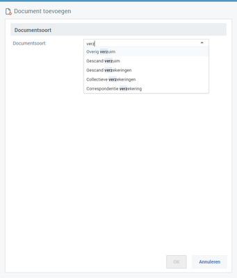 In deze release is dit mechanisme verder uitgebreid met de mogelijkheid om delen van de documentsoorttitel in te voeren. Alle documentsoorten waar de ingevoerde tekens in voorkomen worden getoond in de dropdownlist.