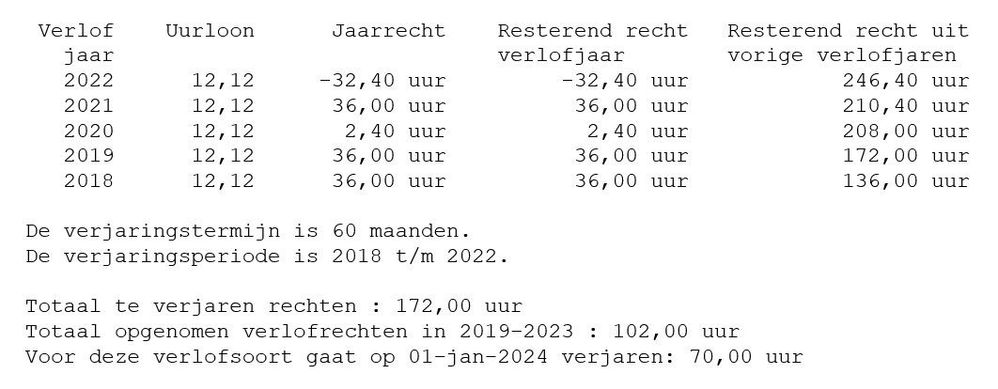 (Vrj datum = datum verjaring verlofrecht en Vrj recht = dagen/uren te verjaren verlofrechten)