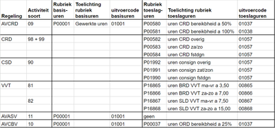 • Indien je andere rubrieken gebruikt voor de toeslaguren in de diverse regelingen dien je natuurlijk de daarbij behorende uitvoercode te koppelen.