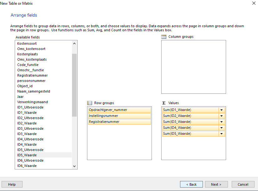 Als de “Wizard” is afgesloten, kom je in het rapport terecht. Zoals je kunt zien zijn de parameters automatisch “gezet”.