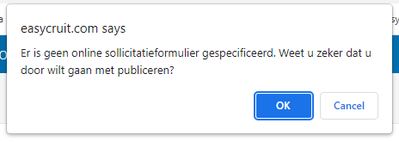 We hebben feedback ontvangen dat de recent ontwikkelde 'geen sollicitatieformulier' waarschuwing verplaatst moet worden naar de publicatie pagina, omdat recruiters de sollicitatieformulier pagina vaak overslaan. Daardoor kregen deze gebruikers de waarschuwing niet te zien en werden vacatures nog steeds zonder sollicitatieformulier gepubliceerd. We hebben de waarschuwing daarom verplaatst naar de allerlaatste stap in de vacature workflow. De waarschuwing verschijnt nu nadat je op ‘Bevestigen’ hebt geklikt.