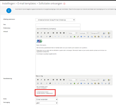 @René van Dijk, bij dit email template worden de gegevens van de vacature eigenaar als afzender gebruikt. Daar zal het samenvoegveld voor werken. Als je een contactpersoon als afzender selecteert, dan mist het veld voor de functie en kan dit samenvoegveld dus niet gebruikt worden. Het staat nog wel op onze backlog om contactpersonen ook met dit veld uit te breiden.