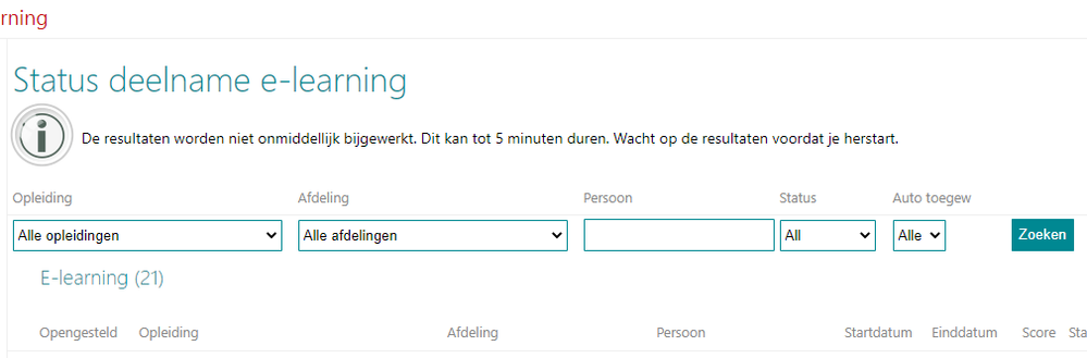 Het duurt even voordat de resultaten van e-learnings zijn verwerkt in Opleidingsmanagement. Tijdens deze periode adviseren wij niet een a-learning te herstarten totdat de resultaten zijn verwerkt in Opleidingsmanagement.