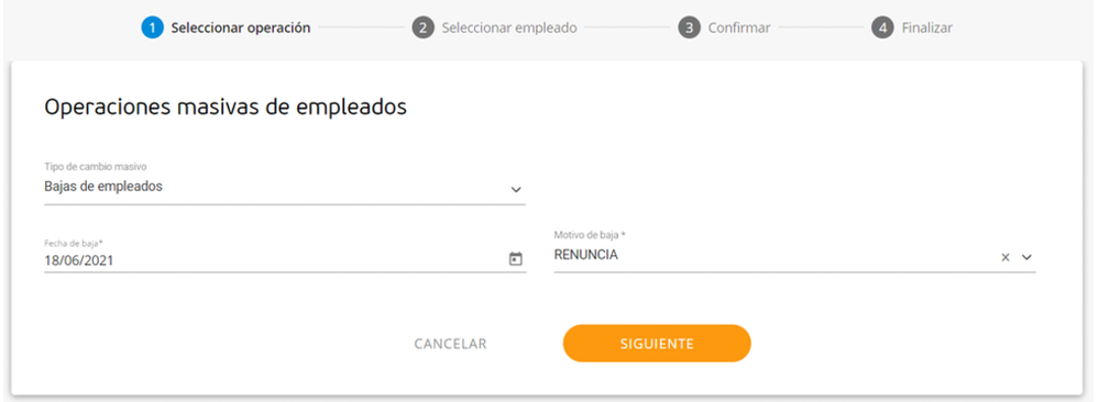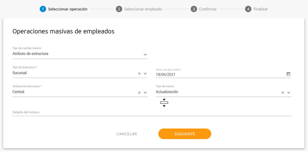 En principio, se ponen a disposición las diferentes operaciones: bajas de empleados, reincorporaciones de empleados, atributo de estructura, reporta a, fecha de ingreso, elementos de trabajo y modelo organizacional. Ahora, veamos en detalle de qué se trata cada una: