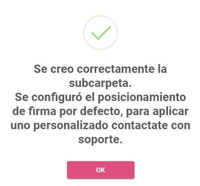 En caso de que la subcarpeta ya exista la plataforma arrojará el error "La subcarpeta ya existe". Si el proceso de alta es exitóso mostrará el siguiente mensaje: