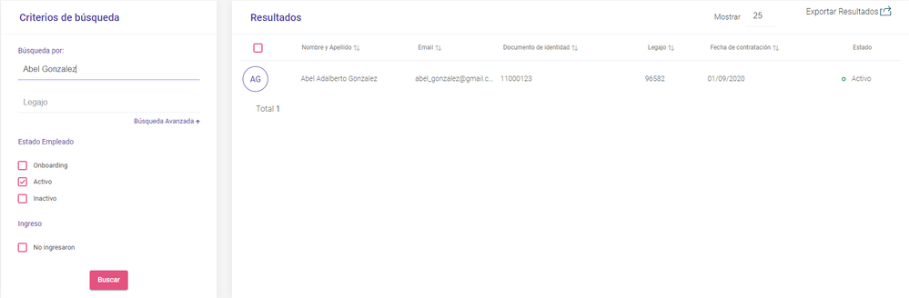 2) Utilizar los Criterios de búsqueda que se encuentran situados del lado izquierdo para localizar a la persona. Pueden utilizarse como filtros de búsqueda los campos DNI o Identificador Local (RUT, RFC, Cédula), Nombre/Apellido etc.