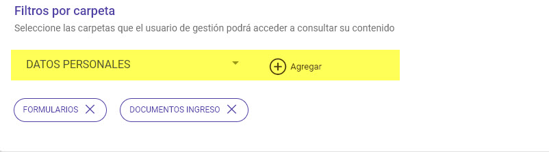 4) Localizar la sección Filtros por carpeta y configurar las carpetas que el usuario de gestión podrá acceder desde el Buscador de documentos según las preferencias del administrador. Es posible configurar más de un filtro por carpeta en simultáneo por medio del botón Agregar.