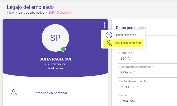 Nota: Una vez realizada la desvinculación no será posible modificar ningún dato del empleado (salvo el email) a menos que se lo reactive en la plataforma.